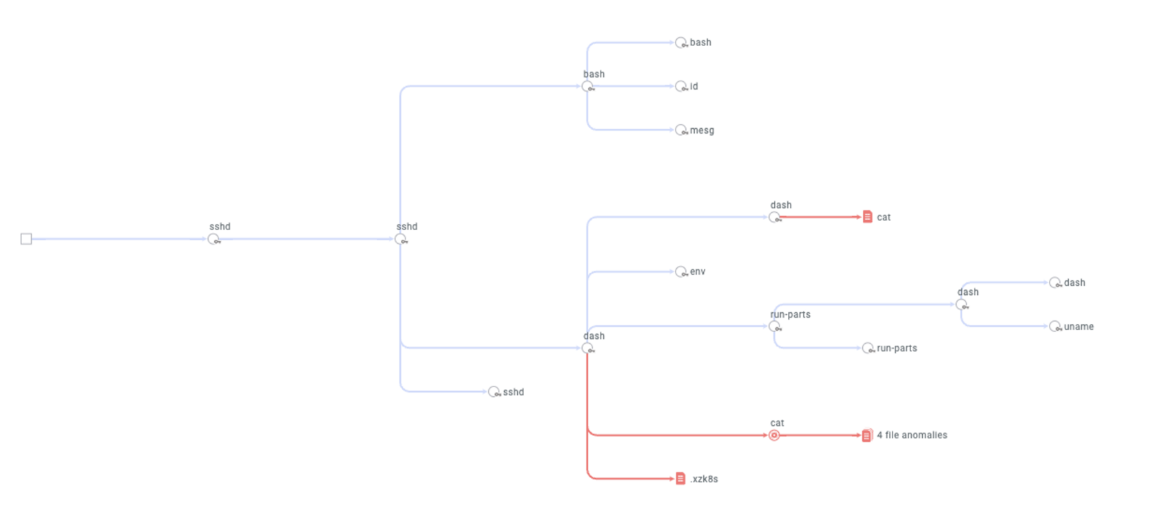 Перейдя в Monitor Mode мы увидим, что появился аномальный процесс cat и создание файла .xzk8s, которого раньше не было, более того он был порожден от sshd.
