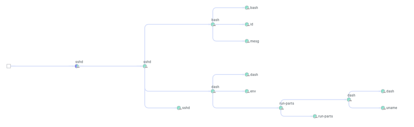После запуска приложения в Kubernetes кластере Luntry обучается на поведении приложения, работающего внутри контейнера. На дереве процессов видно, что ssh сервер используется для легального подключения.